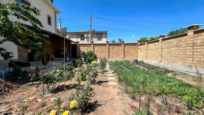 Участок прямоугольной формы, высажены кипарисы и ели. Во дворе система дренажа, мощение тротуарной плиткой.