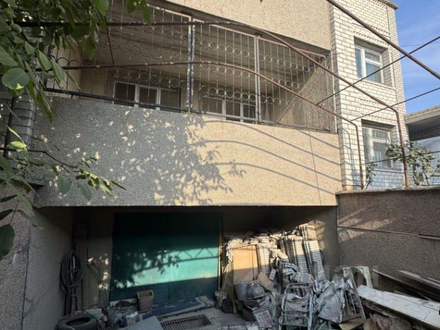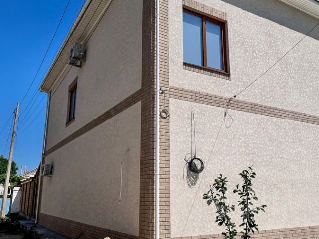 Трёхэтажное здание 165 м2. Материал камень-ракушечник, кровля - металлочерепица, здание оштукатурено снаружи, внутри выложено плиткой из керамогранита на полу и на стенах.