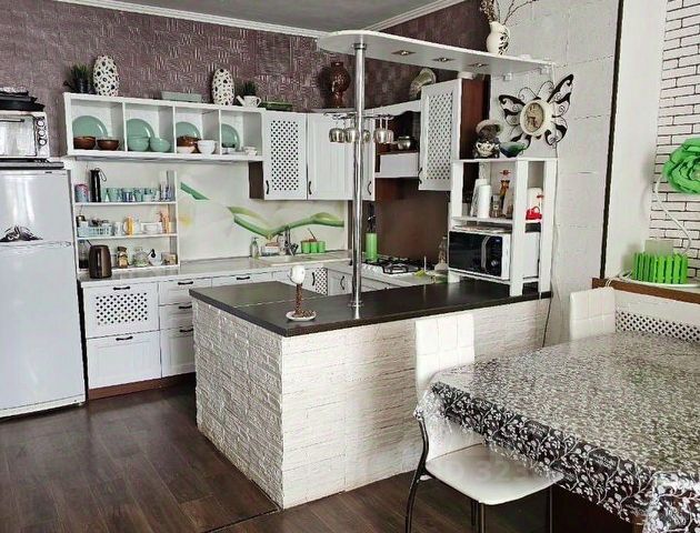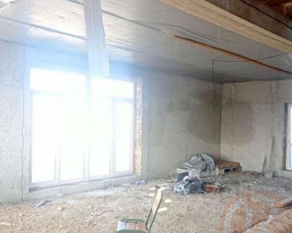 Трёхэтажное здание 165 м2. Материал камень-ракушечник, кровля - металлочерепица, здание оштукатурено снаружи, внутри выложено плиткой из керамогранита на полу и на стенах.