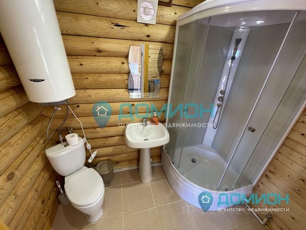 На первом этаже расположена кухня (мебель кухонная, духовка, раковина, холодтльник, вытежка над плитой) и зал- открытое пространство с камином (37.3 кв.м), (раскладной диван, раскладной стол), шторы; совмещенный санузел: пространство для душа с окном, туалет, зона раковины с зеркалом и тумбочкой, рядом вход в бытовую комнату (стиральная машина, бойлер, ёмкость для воды на 80 л); большой коридор с функциональной мебелью- гардеробного типа, гостевая спальня (11.8 м.кв) c мебелью и раскладным диваном, шторы; в коридоре под лестницей есть пространство для хранения.