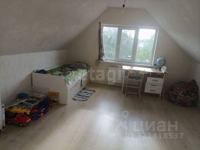 На первом этаже находится кухня, санузел и две комнаты, на втором одна большая комната и две маленькие.