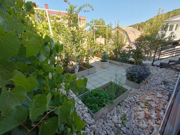 Коттедж 150 кв.м ( 2 этажа и цоколь ), дополнительно к дому примыкает хозблок состоящий из капитального гаража, котельной и мастерской общей площадью 50в.м. и расположен на участке 5 соток. В доме, на первом этаже кухня - где четыре окна, из которых вид на лужайку и во дворик, гостиная и санузел, на втором этаже две небольшие спальни, одна с выходом на балкон, с которого открывается прекрасный вид на лес, небо, звезды.... В цокольном этаже сауна, санузел, большая комната-зал с двумя окнами и отдельным выходом на лужайку. В доме три санузла. Газовое отопление (трехконтурный газовый котел), которое сделано так, что вы можете обогревать только то помещение или комнату, где находитесь..Построен дом из ракушки, облицован силикатным кирпичом, утеплен пенопластом и покрыт "короедом". Водопровод центральный+ скважина+ накопитель на 3 куба. Канализация - две ямы, одна подведена к кухне, вторая к санузлам . Ухоженный участок с газоном , фруктовыми деревьями и растения из крымских питомников.