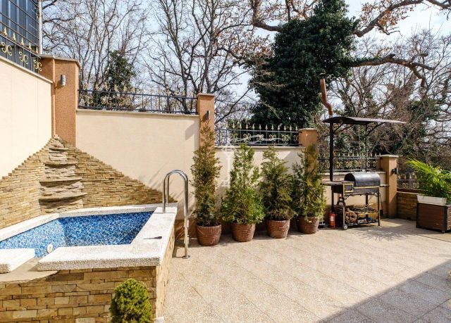 • Ландшафтный дизайн, пруд с водопадом (23 куб.м), бассейн 8 м, купель, мангальная зона, теннисный стол, мягкая мебель из ротанга на террасе.
