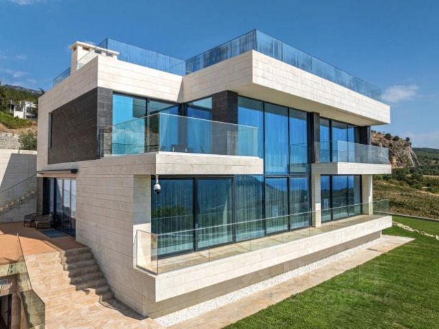 Фасады выполнены из натурального камня и облицованы турецким гранитом и мрамором, элементы декора и кованые решётки на окнах изготовлены из художественной ковки. Архитектура дополнена изящными балконами, арочными проёмами и эффектной входной группой с каменной лестницей, создавая атмосферу респектабельности и статуса.