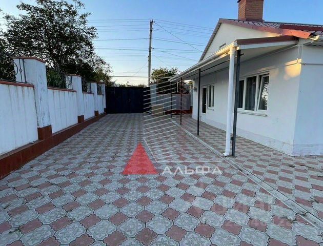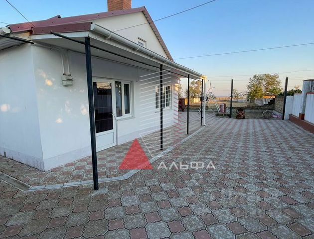 Дворовая территория уложена плиткой, есть небольшой козырек перед домом. Большое парковочное место, на участке заложен фундамент под гараж. Въезд на территорию с двух сторон, передний-главные ворота, второй-с заднего двора. Дом расположен на последней улице поселка, поэтому соседей сзади нет, и открывается вид на поле и залив Донузлав.