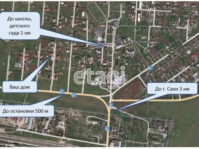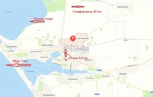 До центра знаменитого города -курорта Саки, 2 км . В самом поселении есть абсолютно всё необходимое для полноценной жизни : школа , садик, аптека, магазины, центральная больница в 4-ех километрах , удобная развязка общественного транспорта( каждые пол часа автобус ). Саки уникален во всех отношениях: в небольшом по масштабам городе находятся семь озёр, которые разделены современной дамбой , ведущей к морю с галечными , широченными пляжами (7 км пешком) , в 6 км находится самое красивое розовое озеро Сасык-Сиваш. Вся остальная информация, касающаяся качества стройки дома , начиная с фундамента... иметься в видео е фотоотчётах и могут быть предоставлены в любой момент . Если Вы задумались о покупке дома ... не откладывайте на "завтра , так как то что не купили сегодня ... Завтра уже будет дороже"( особенно в Крыму!) Звоните , пишите отвечу на все вопросы . продажа от собственника .