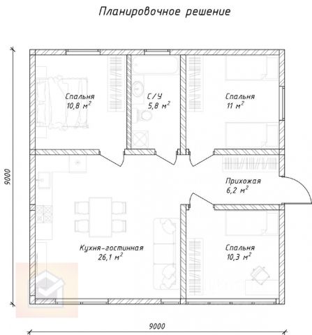 3 спальни, Кухня-гостиная, Санузел, Бойлерная, Коридор, Прихожая