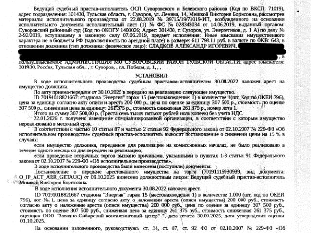 Данные получены с сайта ГИС Торги. Здание, назначение: нежилое, наименование: гараж, площадь 28,8 кв.м., кадастровый номер 71:18:030213:2473, местоположение: Тульская область, Суворовский район, г. Суворов, район стадиона "Энергия"(Восточная сторона), гараж 15. Сведениями о земельном участке, на котором расположено здание, Организатор торгов не располагает. Взыскатель: Администрация МО Суворовский район Тульской обл. Начальная цена: 261 375 (Двести шестьдесят одна тысяча триста семьдесят пять) руб. 00 коп., без НДС. Задаток: 120 000 (Сто двадцать тысяч) руб. 00 коп.; Шаг аукциона 1%: 2 613 (Две тысячи шестьсот тринадцать) руб. 75 коп.