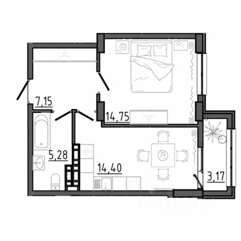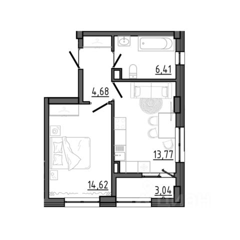 Квартира общей площадью 60 кв. м., жилая 40,8 кв. м.