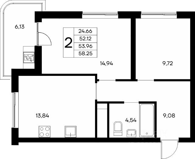 Площадь данной квартиры 62 кв.м, лоджия не входит в общую квадратуру, но она соединяет между собой две комнаты, и добавляет пространства всей квартире.