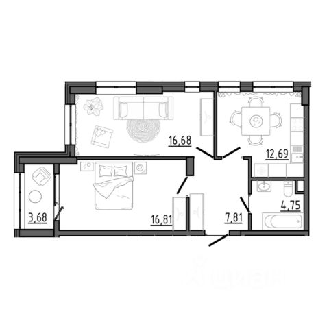 Квартира общей площадью 60 кв. м., жилая 40,8 кв. м.