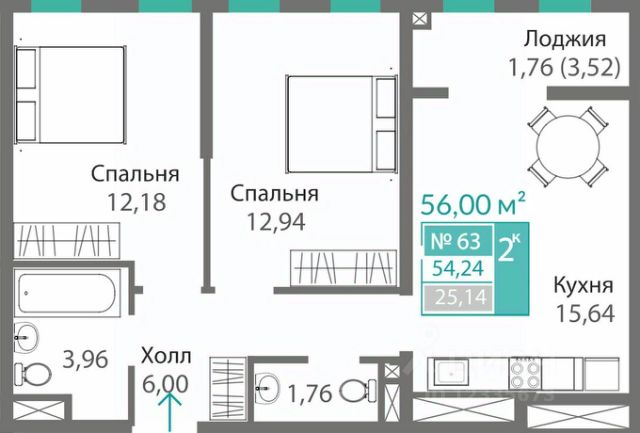 - Площадь:49,6 м² (жилая — 29,8 м², кухня — 7,6 м²)