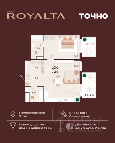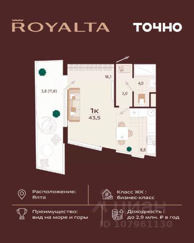 Дворец ХХI века в сердце Крыма! ИНВЕСТИЦИЯ В САМЫЙ ЛИКВИДНЫЙ АКТИВ ЯЛТЫ: Локация всё включено: Вы в шаге от набережной, ресторанов, театров и галерей. Жизнь бурлит прямо у вас под ногами, а тишина и уют ждут вас дома. Максимальная доходность: Спрос на качественное жилье с ВИДОМ НА МОРЕ в центре Ялты — стабильно высокий круглый год. Стоимость только растет: Премиальная недвижимость в условиях ограниченного предложения в центре — лучший актив для сохранения и приумножения капитала. Почему стоит рассмотреть этот проект: • Премиум-класс: закрытая территория, подземный паркинг, бассейн Infinity, террасированный ландшафт, двор без машин. • Роскошь без компромиссов: Сервис 5 звездочного отеля! Премиальная управляющая компания, которая вызовет Вам такси из аэропорта, подготовит квартиру для проживания, либо сдаст номер гостям Ялты! •Вид, который меняет всё: Утренний кофе и вечерний бокал вина с панорамой Ялтинского залива. Ваша главная достопримечательность — прямо за окном. • Высокий инвестиционный потенциал — рост цены уже на этапе стройки Хватит смотреть на море - пора жить с видом на него! Звоните — расскажу про гибкие условия оплаты в Вашей Южной резиденции!