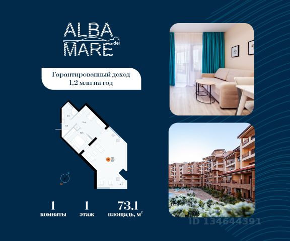 Продаются апартаменты в построенном комплексе. Срок сдачи 4 квартал 2024 года. Альба Дель Маре это комплекс апартаментов бизнес-класса с развитой инфраструктурой. Уютные здания переменной этажности строятся в 5 минутах ходьбы (385 метров) от одного из лучших пляжей Евпатории "Супер Аква Бич". Широкая береговая линия, места для активного отдыха и зоны релакса позволят насладиться отдыхом на любой вкус. Архитектурное решение комплекса создает истинное ощущение Средиземноморья и присутствия на дорогом курорте: скатные черепичные крыши, козырьки и навесы-перголы, арочные завершения проемов, цветовая палитра отделки и фасадов, где используются оттенки желтого, охры, терракоты и бежевого. Переменная этажность здания формирует камерность проекта, создавая прекрасные видовые характеристики для каждого апартамента. Просторные террасы с видом на море, патио с собственным выходом к бассейну на первых этажах комплекса, детская и спортивная площадки, ландшафтный дизайн здесь все создано для роскошного отдыха и расслабления. Территория комплекса апартаментов закрыта и находится под круглосуточным видеонаблюдением, что позволит резидентам и гостям чувствовать безопасность проживания. Концепция комплекса: комфорт проживания с первых дней заселения. Реализация апартаментов осуществляется с полной отделкой под ключ. Собственники апартаментов имеют возможность поручить управление недвижимостью профессиональному оператору, что позволит получать стабильный доход. Автономная газовая котельная позволит не зависеть от внешних отключений отопления., парковочные места на закрытой территории комплекса обеспечат безопасность вашему автомобилю, система центрального кондиционирования создаст комфортную температуру в каждом номере. Жилой комплекс реализуется в соответствии с 214 ФЗ.