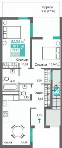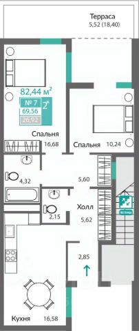 Общая площадь квартиры 77 кв.м., жилая 31 кв.м., кухня-гостиная 33 кв.м., коридор, два отдельных санузла и патио 40 кв.м.