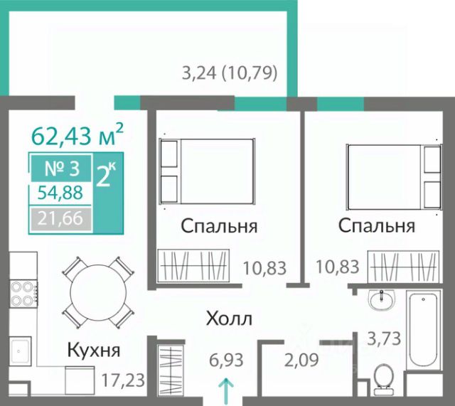 - Комнаты: 3 спальни, кухня-гостиная, 2 санузла
