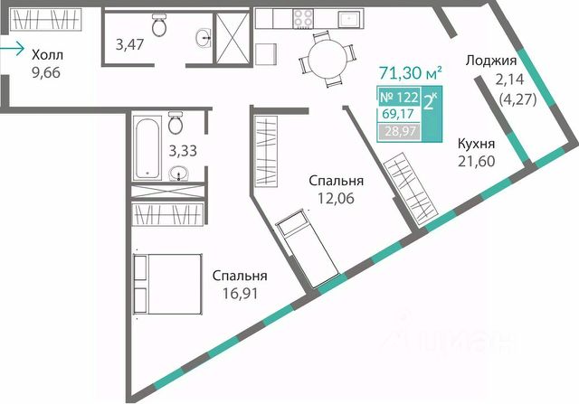 квартир: компактные студии от 34,9 кв. м; универсальные однокомнатные от 38,9 кв.