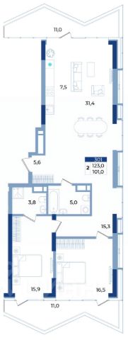 +2 комнаты, спальня и гостиная с диванами и зоной кухни