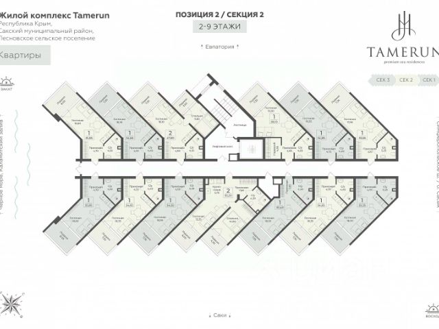 "Tamerun" - морская резиденция на Западном берегу Крыма, между городами Евпатория и Саки. Резиденция "Tamerun" представляет собой современный комплекс из четырёх корпусов высотой 9 и 12 этажей, гармонично вписанных в живописный ландшафт. Интерьеры выполнены в изысканном элегантном стиле с применением премиальных материалов — натурального мрамора, ценных пород дерева и высококачественной кожи. Просторные помещения наполнены естественным светом благодаря большим панорамным окнам, открывающим завораживающие виды на Черное море. Атмосфера резиденции пропитана уютом и гармонией, создавая идеальные условия для комфортной жизни и отдыха. Рядом с "Tamerun" находится Сасыкский заказник и самое крупное в Крыму солёное розовое озеро Сасык-Сиваш. На территории резиденции находится открытый бассейн с подогревом, окружённый шезлонгами и зоной отдыха, где можно наслаждаться теплыми лучами солнца и свежим морским бризом. Для любителей активного отдыха предусмотрен теннисный корт и фитнес-зал, оборудованный новейшими тренажёрами. В солнечной резиденции есть всё для жизни и интересного отдыха: собственный песчаный пляж и теннисный корт, бассейны с морской водой, рестораны и летнее кафе, зона СПА и фитнес-центр, общественно-деловые пространства и подземный паркинг. Профессиональная сервисная компания с международным опытом возьмёт на себя все операционные вопросы по управлению и эксплуатации, обеспечивая 5-звёздочный уровень обслуживания. Купить квартиру на 4 этаже в Саки.