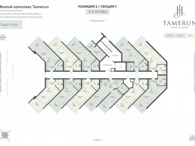 "Tamerun" - морская резиденция на Западном берегу Крыма, между городами Евпатория и Саки. Резиденция "Tamerun" представляет собой современный комплекс из четырёх корпусов высотой 9 и 12 этажей, гармонично вписанных в живописный ландшафт. Интерьеры выполнены в изысканном элегантном стиле с применением премиальных материалов — натурального мрамора, ценных пород дерева и высококачественной кожи. Просторные помещения наполнены естественным светом благодаря большим панорамным окнам, открывающим завораживающие виды на Черное море. Атмосфера резиденции пропитана уютом и гармонией, создавая идеальные условия для комфортной жизни и отдыха. Рядом с "Tamerun" находится Сасыкский заказник и самое крупное в Крыму солёное розовое озеро Сасык-Сиваш. На территории резиденции находится открытый бассейн с подогревом, окружённый шезлонгами и зоной отдыха, где можно наслаждаться теплыми лучами солнца и свежим морским бризом. Для любителей активного отдыха предусмотрен теннисный корт и фитнес-зал, оборудованный новейшими тренажёрами. В солнечной резиденции есть всё для жизни и интересного отдыха: собственный песчаный пляж и теннисный корт, бассейны с морской водой, рестораны и летнее кафе, зона СПА и фитнес-центр, общественно-деловые пространства и подземный паркинг. Профессиональная сервисная компания с международным опытом возьмёт на себя все операционные вопросы по управлению и эксплуатации, обеспечивая 5-звёздочный уровень обслуживания. Продается квартира на 5 этаже в Саки.