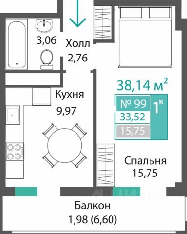 Квартира состоит из просторной комнаты 20,5 м2 и кухни-столовой 10,9 м2, соединенной с лоджией 2 м2, большой прихожей 11,9 м2 и совмещенного санузла 4 м2. Высота потолков 2,85 м.