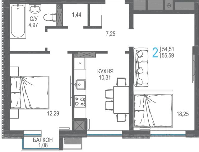 Продаётся 2-комнатная квартира в строящемся доме (Дом 2), срок сдачи: III-кв. 2026, общей площадью 55.83 кв.м., на 5 этаже. Жилой комплекс от застройщика "Интерстрой" в п.г.т. Гвардейское Симферопольского района на улице Курганная.