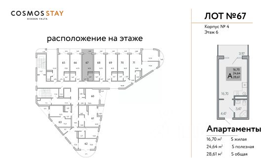 ГОТОВЫЙ БИЗНЕС ПОД КЛЮЧ ДОХОД ОТ 1 500 000 руб. с первого года деятельности отеля. Продаются апартаменты от Застройщика в строящемся комплексе COSMOS STAY HIDDEN YALTA, под управлением ведущего отельера в России COSMOS HOTEL GROUP (COSMOS HOTEL GROUP это Аккредитованная Управляющая компания международных гостиничных операторов). ИНВЕСТИЦИОННЫЕ ПРЕИМУЩЕСТВА КОМПЛЕКСА: - Первый COSMOS STAY в Ялте- Гостиничный номер с ремонтом, мебелью и техникой - Управление номерным фондом командой COSMOS- Прозрачность управления - Гарантированная круглогодичная загрузка комплекса - Глубокое знание и владение бизнесом - БИЗНЕС-МОДЕЛЬ Будущего: круглогодичный и пассивный доход - Среднегодовая доходность 22 % О КОМПЛЕКСЕ COSMOS STAY HIDDEN YALTA это комплекс апартаментов из 5 корпусов для отдыха с собственной развитой инфраструктурой. Находится в Ялте у подножья горы Могаби на южном берегу Крыма, вблизи с живописным горнолесным заповедником, у подножья горы Ай-Петри. Из апартаментов комплекса открываются завораживающие виды на горные вершины и Черное море. ЭТАЖНОСТЬ КОРПУСОВ: до 9 этажей Срок сдачи объекта: IV-кв. 2026г. Квадратура апартаментов: от 25м2 до 80,4 м2. Апартаменты с отделкой и мебелью. ИНФРАСТРУКТУРА КОМПЛЕКСА - Лаунж-зоны - Спа-центр - Детские пространства и площадки для спорта - Всесезонный бассейн - Пространства для медитаций и занятий йогой - Ресторан и Лобби - Супермаркеты и аптека - Консьерж-сервис полного цикла обслуживания с управлением - Экотропы для прогулок - Канатная дорога в 20 минутах КОНЦЕПЦИЯ АПАРТ-КОМПЛЕКСА Предлагает уникальный формат отдыха в стиле Retreat. Здесь созданы идеальные условия комфортного отдыха, заботы о вашем ментальном и физическом здоровье, вдали от городской суеты, в окружении векового леса и природы. Здесь вы найдете всё необходимое для восстановления и перезагрузки. Рассрочка от застройщика, подробности уточняйте в Отделе продаж. Строительство ведется при проектном финансировании СБЕРБАНКА, согласно ФЗ-214. Продажа через эскроу-счета без комиссий и переплат.