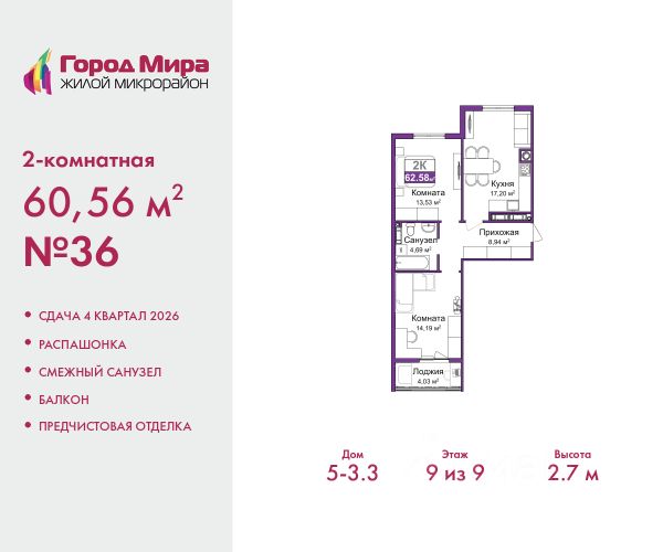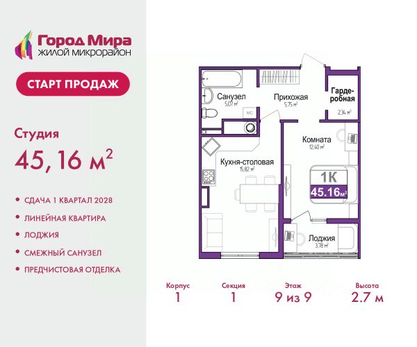 Продается 2-комн. квартира с европланировкой и предчистовой отделкой в ЖМ "Город Мира" на 9 этаже. Общая площадь: 42.4 кв.м., жилая: 22.17 кв.м., суммарная площадь гостиной-столовой с кухонной зоной: 17.25 кв.м. Европланировка, кухня-гостиная - идеальный вариант для тех, кто любит часто принимать гостей. Комнаты изолированные, все окна выходят на одну сторону. В квартире один балкон, один совмещенный санузел. Высота потолков 2.7 м. "Город Мира" это масштабный жилой комплекс, созданный для тех, кто ценит комфорт, безопасность и гармонию с природой. Здесь продумана каждая деталь от удобной инфраструктуры до эргономичных планировок квартир. "Город Мира" победил в номинации "Лучший экологический проект года в сфере строительства" по версии премии Сrimеа Urbаn Аwаrds. Способы приобретения недвижимости в "Городе Мира": 1. Ипотека: семейная от 5,5%, военная, IT-ипотека, базовая ипотечная программа и комбо-ипотека. Одобрение заявки проходит сразу в отделе продаж. 2. Материнский капитал на первый взнос. 3. Рассрочка от застройщика - до июня 2028 года! Первоначальный взнос от 30%. 4. Военная ипотека. Участники НИС могут приобрести квартиры по спец.цене. Ключевые преимущества комплекса: удачное расположение зеленый район с благоприятным микроклиматом продуманное зонирование жилые кварталы, зоны отдыха и коммерческие объекты комфорт-класс высокое качество строительства и современные инженерные решения Почему выбирают "Город Мира": Образование и досуг: 2 детских сада (по 260 мест каждый) планируется строительство общеобразовательной школы детские и спортивные площадки в каждом дворе беседки для отдыха, зоны для выгула собак Ритейл и сервис: магазины, аптеки, медицинские центры фитнес-клубы, салоны красоты детские развивающие центры Парковки: гостевые парковки наземные и подземные паркинги Квартиры с продуманным комфортом: просторные планировки с гардеробными и 2-мя санузлами лоджии с остеклением автономное отопление выполнена стяжка пола Благоустройство территории: ландшафтный дизайн с зонами отдыха современные детские площадки стильные холлы с дизайнерской отделкой система видеонаблюдения для безопасности "Город Мира" это место, где созданы все условия для комфортной жизни. Выбирайте качество и продуманность в каждой детали! Дом монолитно-блочный, двухподъездный, высотой 9 этажей. Квартира находится во 2-й секции в корпусе 1. На этаже 5 квартир. В подъезде 1 пассажирский и 1 грузовой лифт. Окончание строительства - 1 квартал 2028 года. Оформление сделки по договору долевого участия. #z6ESEz