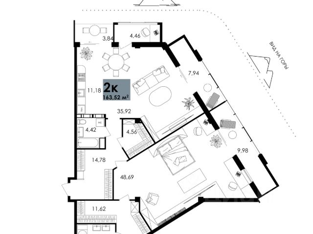 Благодаря панорамному остеклению в апартаменте всегда много естественного света и визуально расширено пространство.