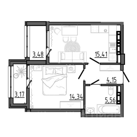 Квартира общей площадью 60 кв. м., жилая 40,8 кв. м.