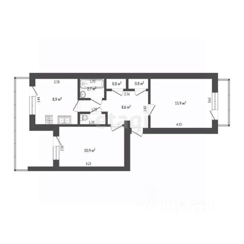 жилая площадь составляет 45,6 кв. м. с комфортными по площади изолированными комнатами. (18,4 кв. м.+ 12,9 кв. м. + 14,2 кв. м.).