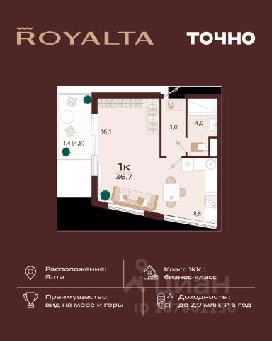 Просторная студия в современном жилом комплексе в ЖК"Ботаникa" ("ВОТANICА") в Ялте предлагает редкое сочетание городского комфорта и близости к природе. Студия площадью 33.1 м². От собственника - переуступка. Объект сдаётся с качественной предчистовой отделкой, что позволяет новому владельцу сразу выполнить финальный ремонт по собственному вкусу. Ключевыми преимуществами являются высота потолков 3 метра и панорамные окна, создающие ощущение максимально открытого и светлого пространства, а также наличие просторной лоджии. Жилой комплекс обеспечивает высокий уровень приватности и безопасности благодаря концепции закрытого двора. Для автомобилистов предусмотрен подземный паркинг с прямым спуском на лифте. На благоустроенной территории расположены подогреваемый бассейн, доступный круглый год, зоны для занятий спортом и панорамный ресторан. Эксплуатируемая кровля открывает дополнительные возможности для отдыха. Расположение является стратегическим: в нескольких минутах ходьбы находятся сквер Победы, горно-лесной заповедник и Массандровский парк. Пляжная зона Черного моря доступна на автомобителе за 7 минут, а пешая прогулка займет около 20-25 минут. Расстояние до аэропорта Симферополь составляет 95 км. Рассматривается приобретение в ипотеку. МЫ ГАРАНТИРУЕМ ФИНАНСОВУЮ БЕЗОПАСНОСТЬ ДЛЯ НАШИХ КЛИЕНТОВ. Полное юридическое сопровождение сделки. Высокий шанс одобрения ипотеки. Звоните, с удовольствием ответим на ваши вопросы! Код пользователя: 190344 Номер в базе: 10212929 МЫ ГАРАНТИРУЕМ ФИНАНСОВУЮ БЕЗОПАСНОСТЬ ДЛЯ НАШИХ КЛИЕНТОВ. Полное юридическое сопровождение сделки. Высокий шанс одобрения ипотеки. Звоните, с удовольствием ответим на ваши вопросы! Код пользователя: 190238 Номер в базе: 10212929