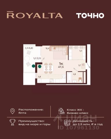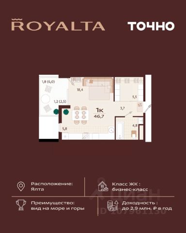 Беспроцентная рассрочка на 3 года! Выгодное инвестиционное предложение для пассивного дохода - резиденция "Роялта". Покупай сейчас , получай доход уже через год! Позвони по телефону и мы отправим тебе полный инвестиционной расчет. Резиденция для роскошной жизни На территории "Роялты" — тишина и спокойствие в окружении зелени. Но стоит только захотеть: набережная Ялты — в пяти минутах, а чтобы выехать в мини-путешествие по Большой Ялте нужно всего лишь пару минут — и вы на шоссе. ЗАКРЫТЫЙ ДВОР- Территория вокруг домов закрыта от автомобилей и доступна только жителям ПОДЗЕМНЫЙ ПАРКИНГ - Удобная территория для размещения автомобилей с доступом прямо из подъезда. На каждую квартиру запланировано одно парковочное место. Оазис проекта — бассейн с прозрачной внешней стеной, где кристальная вода сливается с горизонтом, создавая иллюзию бесконечности. Здесь можно парить над водой и окружающими пейзажами — момент становится наслаждением, а не просто отдыхом.