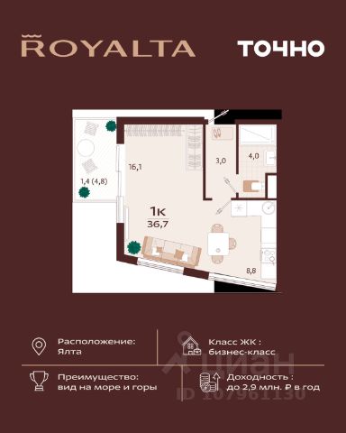 • Местоположение: Ялта, недалеко от моря, с панорамным видом на центр города. Это предполагает близость к городской набережной, основным достопримечательностям и развитой инфраструктуре курортного города.
