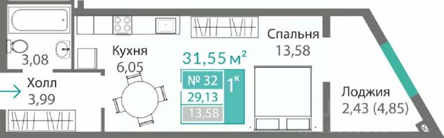 Квартира в жилом состоянии, большая комната, совмещенный санузел, кухня. Коммуникации все центральные: свет, вода, газ, отопление, на горячую воду - газовая колонка, интернет.