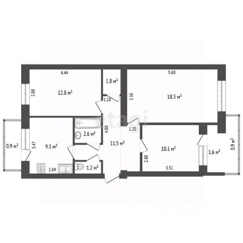Площадь с учетом двух лоджий: 45,8 кв.м.