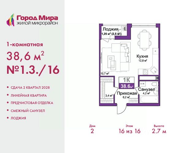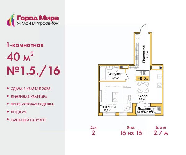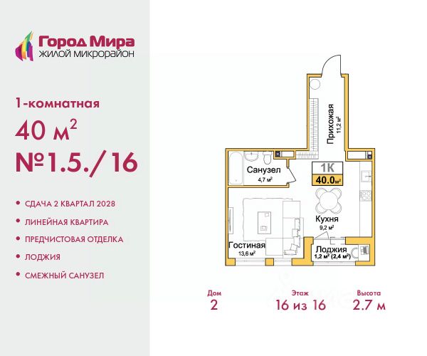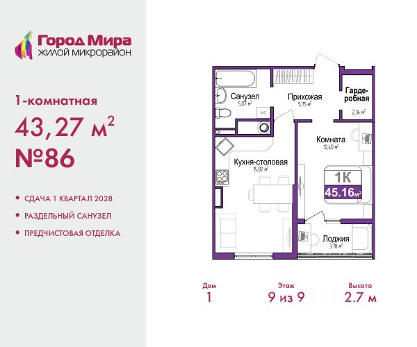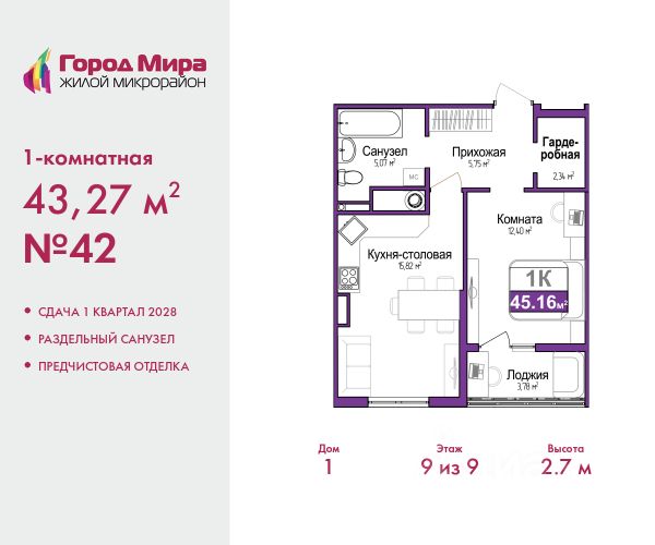 1-комн. квартира с предчистовой отделкой в ЖМ "Город Мира" на 9 этаже. Общая площадь: 43.27 кв.м., жилая: 12.4 кв.м., площадь просторной кухни-столовой: 15.82 кв.м. Все окна выходят на одну сторону. В квартире одна лоджия, один совмещенный санузел. Высота потолков 2.7 м. "Город Мира" это масштабный жилой комплекс, созданный для тех, кто ценит комфорт, безопасность и гармонию с природой. Здесь продумана каждая деталь от удобной инфраструктуры до эргономичных планировок квартир. "Город Мира" победил в номинации "Лучший экологический проект года в сфере строительства" по версии премии Сrimеа Urbаn Аwаrds. Способы приобретения недвижимости в "Городе Мира": 1. Ипотека: семейная от 5,5%, военная, IT-ипотека, базовая ипотечная программа и комбо-ипотека. Одобрение заявки проходит сразу в отделе продаж. 2. Материнский капитал на первый взнос. 3. Рассрочка от застройщика - до июня 2028 года! Первоначальный взнос от 30%. 4. Военная ипотека. Участники НИС могут приобрести квартиры по спец.цене. Ключевые преимущества комплекса: удачное расположение зеленый район с благоприятным микроклиматом продуманное зонирование жилые кварталы, зоны отдыха и коммерческие объекты комфорт-класс высокое качество строительства и современные инженерные решения Почему выбирают "Город Мира": Образование и досуг: 2 детских сада (по 260 мест каждый) планируется строительство общеобразовательной школы детские и спортивные площадки в каждом дворе беседки для отдыха, зоны для выгула собак Ритейл и сервис: магазины, аптеки, медицинские центры фитнес-клубы, салоны красоты детские развивающие центры Парковки: гостевые парковки наземные и подземные паркинги Квартиры с продуманным комфортом: просторные планировки с гардеробными и 2-мя санузлами лоджии с остеклением автономное отопление выполнена стяжка пола Благоустройство территории: ландшафтный дизайн с зонами отдыха современные детские площадки стильные холлы с дизайнерской отделкой система видеонаблюдения для безопасности "Город Мира" это место, где созданы все условия для комфортной жизни. Выбирайте качество и продуманность в каждой детали! Дом монолитно-блочный, двухподъездный, высотой 9 этажей. Квартира находится во 2-й секции в корпусе 1. На этаже 5 квартир. В подъезде 1 пассажирский и 1 грузовой лифт. Окончание строительства - 1 квартал 2028 года. Оформление сделки по договору долевого участия. #z6eg24