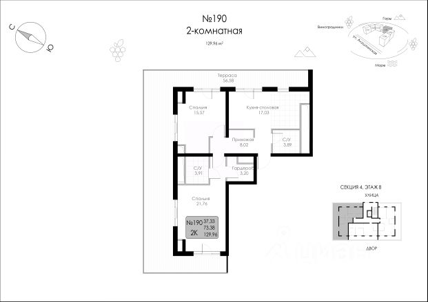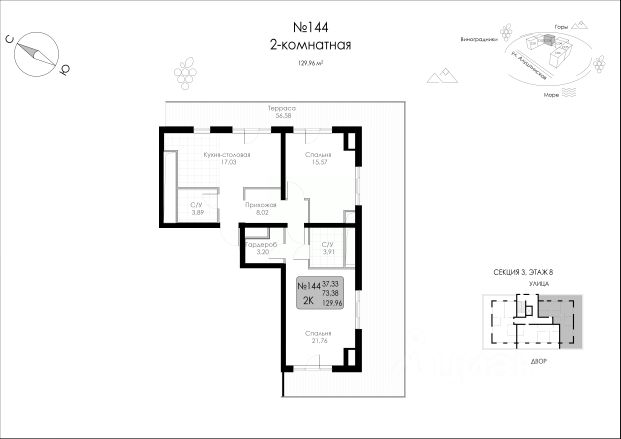 Продается просторная двухкомнатная квартира площадью 82 кв.м. на восьмом этаже нового монолитного дома в центре Судака.