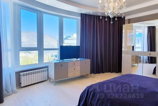 Мастер-спальня сделана отдельным приватным блоком — со своим санузлом и гардеробной. Панорамные окна выходят прямо на Аю-Даг. Установлен новый спальный гарнитур и кровать 180200.