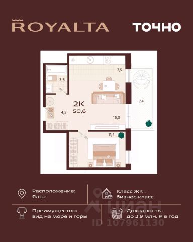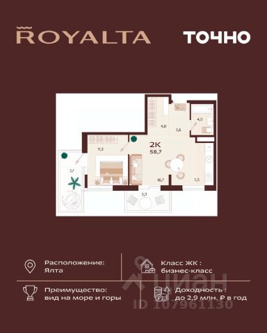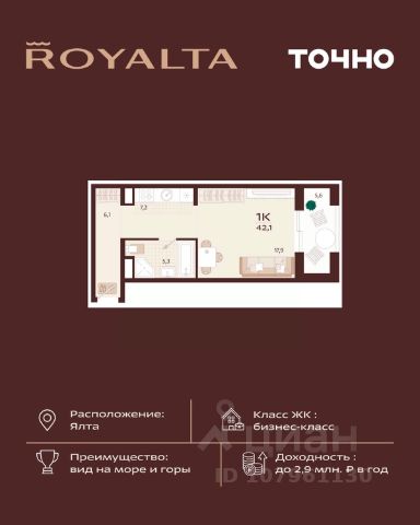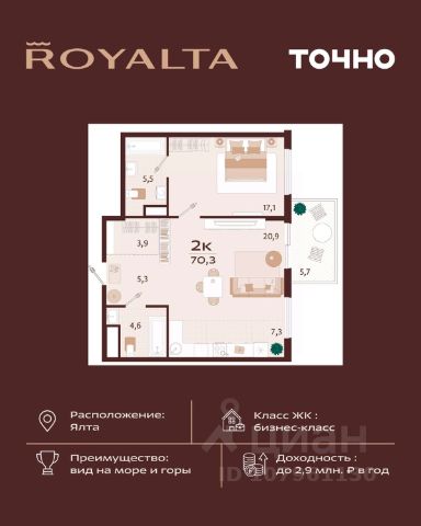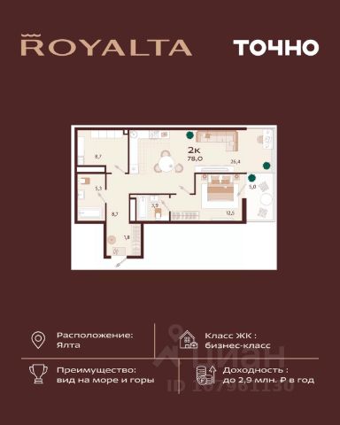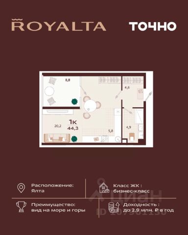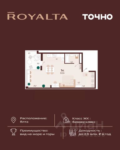 Жилой комплекс "РОЯЛТА" включает 5 монолитно-кирпичных девятиэтажных зданий. Проект предлагает квартиры различных планировок: от однокомнатных до трехкомнатных с расширенными балконами и террасами до 13,4 м2. Территория будет благоустроена детскими игровыми и спортивными площадками, гостевой автостоянкой и озеленением, включая газоны, деревья и кустарники. Также появятся современные уличные тренажёры, СПА-комплекс и панорамный инфинити-бассейн. В шаговой доступности находятся центральная набережная Ялты, детские сады, школы, супермаркеты, торговые центры, Ялтинский медицинский колледж, автовокзал и Мордвиновский парк.
