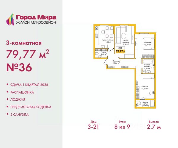 Однокомнатная квартира с предчистовой отделкой в ЖМ "Город Мира" на 3 этаже. Общая площадь: 40.33 кв.м., жилая: 9.96 кв.м., площадь просторной кухни-столовой: 17.71 кв.м. Все окна выходят на одну сторону. В квартире один балкон, один совмещенный санузел. Высота потолков 2.7 м. Жилой комплекс "Город Мира" комфорт и гармония в современном формате. "Город Мира" это масштабный жилой комплекс, созданный для тех, кто ценит комфорт, безопасность и гармонию с природой. Здесь продумана каждая деталь от удобной инфраструктуры до эргономичных планировок квартир. В 2024 году микрорайон "Город Мира" победил в номинации "Лучший экологический проект года в сфере строительства" по версии премии Crimea Urban Awards. Ключевые преимущества комплекса: - удачное расположение зеленый район с благоприятным микроклиматом - продуманное зонирование жилые кварталы, зоны отдыха и коммерческие объекты - комфорт-класс высокое качество строительства и современные инженерные решения Инфраструктура "Города Мира": Образование и досуг: - 2 детских сада (по 260 мест каждый) - планируется строительство общеобразовательной школы - детские и спортивные площадки в каждом дворе - беседки для отдыха, зоны для выгула собак Ритейл и сервис: - магазины, аптеки, медицинские центры - фитнес-клубы, салоны красоты - детские развивающие центры Парковки: - гостевые парковки - наземные и подземные паркинги Квартиры с продуманным комфортом: - просторные планировки с кладовыми и колясочными - лоджии с остеклением - автономное отопление (по 23 дому: индивидуальное отопление) - выполнена стяжка пола (по 3, 4, 20, 21, 22 домам: выполненная стяжка пола и штукатурка стен) - Консьерж-сервис для дополнительного удобства Благоустройство территории: - ландшафтный дизайн с зонами отдыха - современные детские площадки - стильные холлы с дизайнерской отделкой - система видеонаблюдения для безопасности "Город Мира" это место, где созданы все условия для комфортной жизни. Выбирайте качество и продуманность в каждой детали! Квартира находится в корпусе 3_21. Дом монолитный, одноподъездный, высотой 9 этажей. В подъезде 1 грузовой лифт. Окончание строительства - 1 квартал 2026 года. Оформление сделки по договору долевого участия. #zmMzUE Купить квартиру в ипотеку в новостройке в районе Центральный в городе Симферополь.
