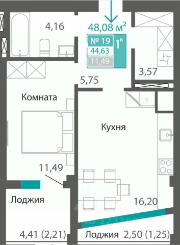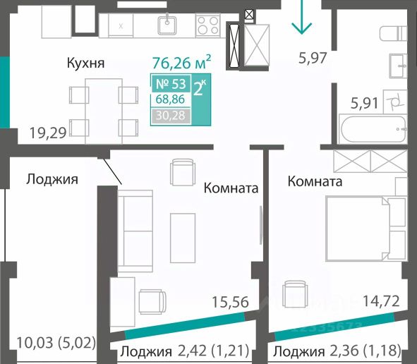 Общая площадью 68,5 кв. м, две отдельные комнаты (19.6 и 9), большая кухня-гостиная 24,5 кв. м, просторный санузел 4,6 кв. м, прихожая 4,0 кв. м, балкон 2,2 кв. м.