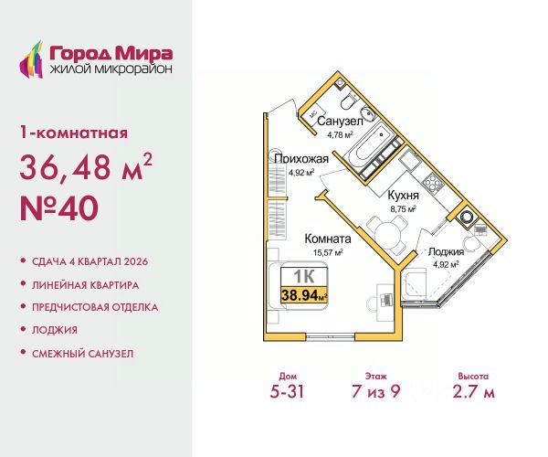 Успейте забронировать по этой цене, период акции ограничен! Стоимость квартиры указана со скидкой, ваша экономия составит 214,710 руб. По всем вопросам обращайтесь в офис продаж, мы вам все подробно расскажем. 1-комн. квартира с предчистовой отделкой в ЖМ "Город Мира" на 16 этаже. Общая площадь: 38.6 кв.м., жилая: 10.7 кв.м., площадь просторной кухни-столовой: 12.8 кв.м. Все окна выходят на одну сторону. В квартире одна лоджия, один совмещенный санузел. Высота потолков 2.7 м. "Город Мира" это масштабный жилой комплекс, созданный для тех, кто ценит комфорт, безопасность и гармонию с природой. Здесь продумана каждая деталь от удобной инфраструктуры до эргономичных планировок квартир. "Город Мира" победил в номинации "Лучший экологический проект года в сфере строительства" по версии премии Сrimеа Urbаn Аwаrds. Способы приобретения недвижимости в "Городе Мира": 1. Ипотека: семейная от 5,5%, военная, IT-ипотека, базовая ипотечная программа и комбо-ипотека. Одобрение заявки проходит сразу в отделе продаж. 2. Материнский капитал на первый взнос. 3. Рассрочка от застройщика - до июня 2028 года! Первоначальный взнос от 30%. 4. Военная ипотека. Участники НИС могут приобрести квартиры по спец.цене. Ключевые преимущества комплекса: удачное расположение зеленый район с благоприятным микроклиматом продуманное зонирование жилые кварталы, зоны отдыха и коммерческие объекты комфорт-класс высокое качество строительства и современные инженерные решения Почему дом повышенной комфортности 2 в "Городе Мира" это лучшее решение? Образование и досуг: 2 детских сада (по 260 мест каждый) планируется строительство общеобразовательной школы детские и спортивные площадки в каждом дворе беседки для отдыха, зоны для выгула собак Ритейл и сервис: магазины, аптеки, медицинские центры фитнес-клубы, салоны красоты детские развивающие центры Парковки: гостевые парковки наземные и подземные паркинги Квартиры с продуманным комфортом: просторные планировки с кладовыми и колясочными лоджии с остеклением лапомойки для питомцев на первых этажах домов индивидуальное отопление выполнена стяжка пола и штукатурка стен консьерж-сервис для дополнительного удобства Благоустройство территории: ландшафтный дизайн с зонами отдыха современные детские площадки стильные холлы с дизайнерской отделкой система видеонаблюдения для безопасности "Город Мира" это место, где созданы все условия для комфортной жизни. Выбирайте качество и продуманность в каждой детали! Квартира находится во доме повышенной комфортности 2, 4-я очередь. Дом монолитно-каркасный, одноподъездный, высотой 16 этажей. В подъезде 1 пассажирский и 1 грузовой лифт. Окончание строительства - 2 квартал 2028 года. Оформление сделки по договору долевого участия. Квартира находится в корпусе 2. Дом монолитный, одноподъездный, высотой 16 этажей. На этаже 7 квартир. В подъезде 1 пассажирский и 1 грузовой лифт. Окончание строительства - 2 квартал 2028 года. Оформление сделки по Продам квартиру в новостройке с отделкой в районе Центральный в городе Симферополь.