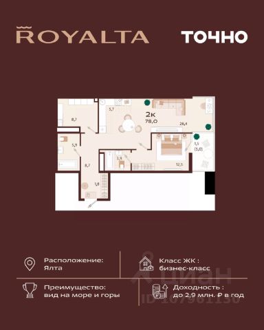 Продаётся просторный апартамент с панорамным видом на горы и боковым видом на Черное море. Площадь 51,76 кв. м.