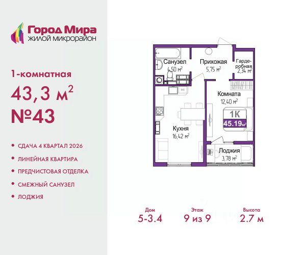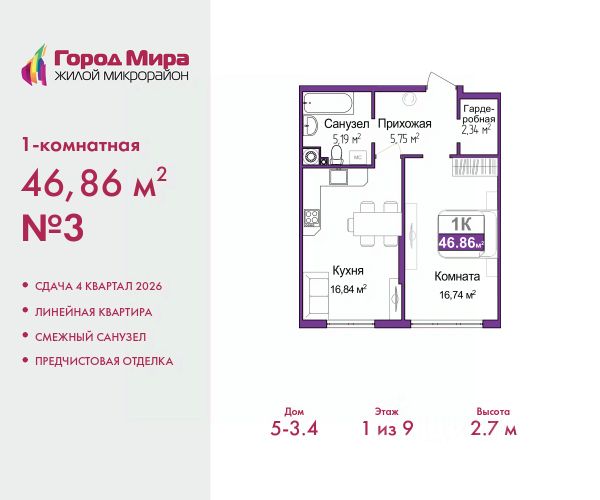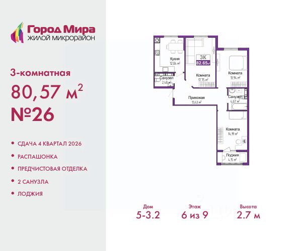 3-комн. квартира от застройщика с предчистовой отделкой в ЖМ "Город Мира" на 5 этаже. Общая площадь: 80.69 кв.м., жилая: 45.88 кв.м., площадь просторной кухни-столовой: 12.04 кв.м. Квартира - распашонка, без проходных комнат, окна выходят на paзные стороны дома. В квартире один балкон, один совмещенный и один раздельный санузел. Высота потолков 2.7 м. Квартиры в ЖК "Город Мира" ваш комфорт начинается здесь! "Город Мира" это масштабный жилой комплекс, созданный для тех, кто ценит комфорт, безопасность и гармонию с природой. Здесь продумана каждая деталь: от удобной инфраструктуры до эргономичных планировок квартир. В 2024 году микрорайон "Город Мира" победил в номинации "Лучший экологический проект года в сфере строительства" по версии премии Crimea Urban Awards. Почему выбирают наш комплекс: - Зеленый оазис живите среди природы в черте города. - Всё под рукой 2 детских сада, магазины, фитнес, медицина. - Безопасность: закрытая территория с видеонаблюдением. Наши квартиры: - Просторные планировки с кладовыми. - Автономное отопление: платите только за реальное потребление. - Готовая предчистовая отделка: стяжка пола, штукатурка стен (кроме 3, 4 домов, где нет штукатурки стен). - Консьерж-сервис и подземный паркинг. Инфраструктура комплекса: - Детские и спортивные площадки. - Зоны отдыха с беседками. - Фитнес-клубы и салоны красоты. - Будущая школа на территории, уже функционируют два детских сада. Выгодные условия покупки: - Ипотека от 5,5%, военная ипотека от 5,5%. - Рассрочка. - Материнский капитал на первоначальный взнос. Квартира находится в корпусе 5_3.4. Дом монолитный, одноподъездный, высотой 9 этажей. В подъезде 1 грузовой лифт. Окончание строительства - 4 квартал 2026 года. Оформление сделки по договору долевого участия. #2691C3