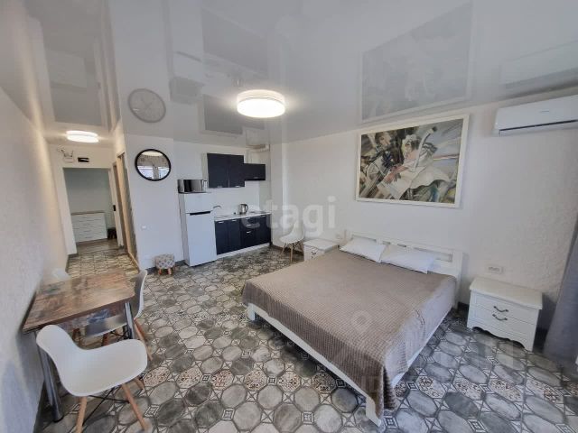 Пространство студии организовано с грамотным зонированием жилой и кухонной зоны (По количеству стационарных спальных мест, возможно единовременное размещение 4-х человек. Совмещенный санузел оснащен современной сантехникой и вместительной душевой кабиной. Имеется бойлерное помещение, где расположен сам бойлер, место для электрического котла с подведенными разводками теплых полов, стиральная машина, пылесос, гладильная доска. Квартира продается со всем, что находится внутри, мебель, техника и т.д.