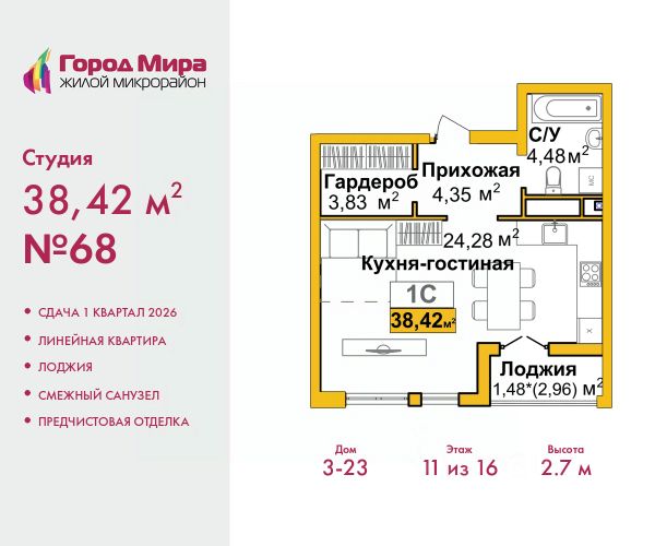 Просторная 1-комн. квартира-студия с предчистовой отделкой в ЖМ "Город Мира" на 11 этаже. Общая площадь: 38.42 кв.м., площадь гостиной 24.28 кв.м., из которых 5 кв.м. выделено под кухонную зону. Все окна выходят на одну сторону. В квартире одна лоджия, один совмещенный санузел. Высота потолков 2.7 м. Жилой комплекс "Город Мира" комфорт и гармония в современном формате. "Город Мира" это масштабный жилой комплекс, созданный для тех, кто ценит комфорт, безопасность и гармонию с природой. Здесь продумана каждая деталь от удобной инфраструктуры до эргономичных планировок квартир. В 2024 году микрорайон "Город Мира" победил в номинации "Лучший экологический проект года в сфере строительства" по версии премии Crimea Urban Awards. Ключевые преимущества комплекса: - удачное расположение зеленый район с благоприятным микроклиматом - продуманное зонирование жилые кварталы, зоны отдыха и коммерческие объекты - комфорт-класс высокое качество строительства и современные инженерные решения Инфраструктура "Города Мира": Образование и досуг: - 2 детских сада (по 260 мест каждый) - планируется строительство общеобразовательной школы - детские и спортивные площадки в каждом дворе - беседки для отдыха, зоны для выгула собак Ритейл и сервис: - магазины, аптеки, медицинские центры - фитнес-клубы, салоны красоты - детские развивающие центры Парковки: - гостевые парковки - наземные и подземные паркинги Квартиры с продуманным комфортом: - просторные планировки с кладовыми и колясочными - лоджии с остеклением - автономное отопление (по 23 дому: индивидуальное отопление) - выполнена стяжка пола (по 3, 4, 20, 21, 22 домам: выполненная стяжка пола и штукатурка стен) - Консьерж-сервис для дополнительного удобства Благоустройство территории: - ландшафтный дизайн с зонами отдыха - современные детские площадки - стильные холлы с дизайнерской отделкой - система видеонаблюдения для безопасности "Город Мира" это место, где созданы все условия для комфортной жизни. Выбирайте качество и продуманность в каждой детали! Квартира находится в корпусе 3_23. Дом монолитный, одноподъездный, высотой 16 этажей. В подъезде 1 пассажирский и 1 грузовой лифт. Окончание строительства - 1 квартал 2026 года. Оформление сделки по договору долевого участия. #zma6Td Продается квартира с лоджией в Симферополе.