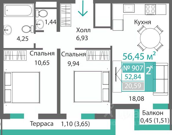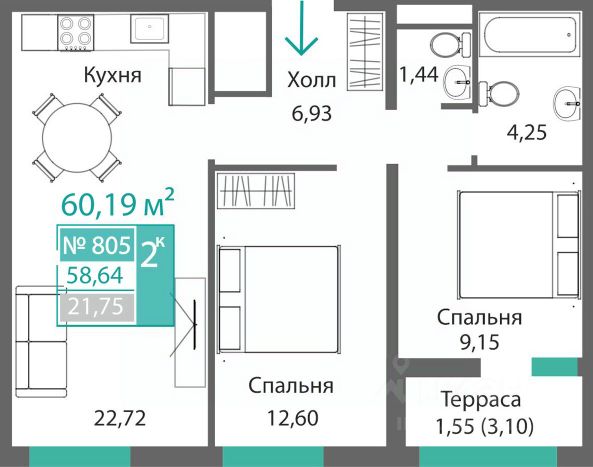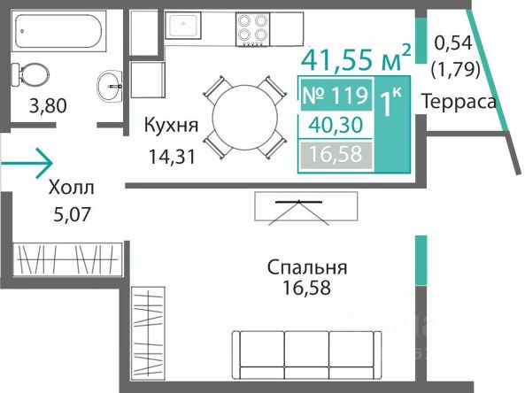 Кухня 8,97 м2, санузел 3,8 м2, комната 14,58 м2, коридор 4,86 м2, гардеробная 3 м2, терраса 3,32 м2.