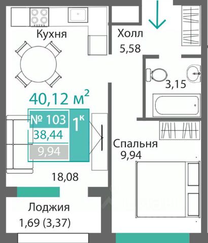 Находится на 7 этаже 8-этажного дома. Общая площадь 38,12 м2.