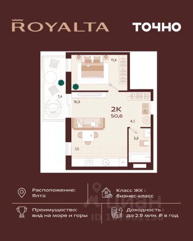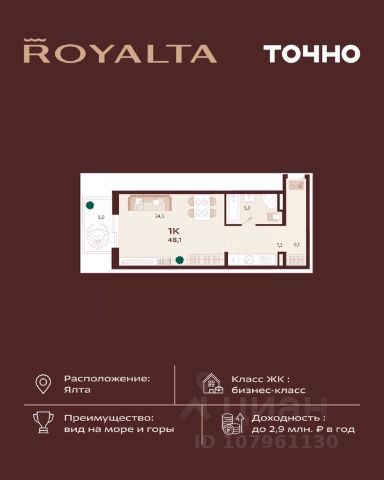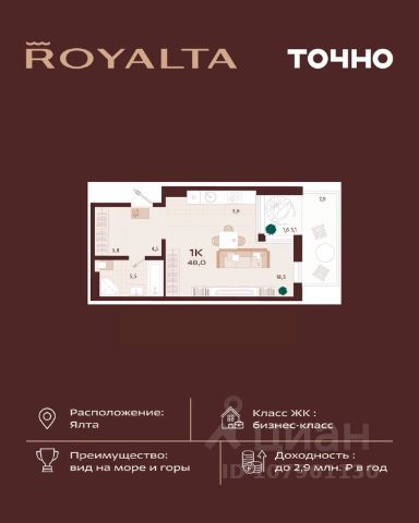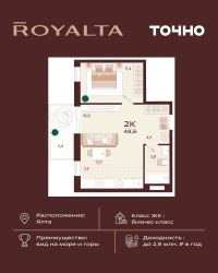Продаю квартиру в жилом комплексе бизнес-класса в Ялте, жемчужине черноморского побережья. Продажа от инвестора! Планировка: 57,34 м2 идеально спланированы в кухню-гостиную, два санузла, спальню, гардеробную и просторную террасу с панорамным видом на море! Высокий этаж! Вид на море и город Уникальность квартала во внутреннем наполнении и акценте на комфорт резидентов. Расширенные террасы, собственный СПА и фитнес-центры, ресторан, торговая галерея и аллея с краснокнижными растениями: всем этим каждый день смогут наслаждаться жители Роялты. Самая высокая точка резиденции - 70 м над уровнем моря. Воздух здесь особенно свеж, а на набережную, старый город и склоны открываются захватывающие виды. Это тихий зеленый район, но всего 15 минут пешей прогулки и вот вы на центральной набережной Ялты: рестораны, магазины и развлечения — к вашим услугам! На все дополнительные вопросы отвечу по телефону! Звоните!